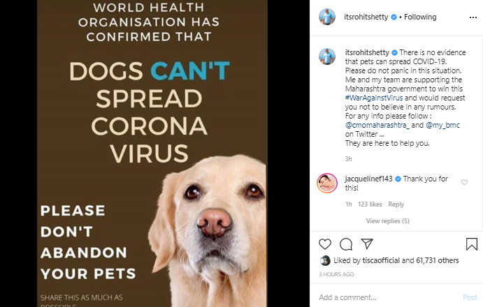 The actor shared an infographic that said, "World Health Organisation has confirmed that dogs can't spread coronavirus. Please don't abandon your pets."