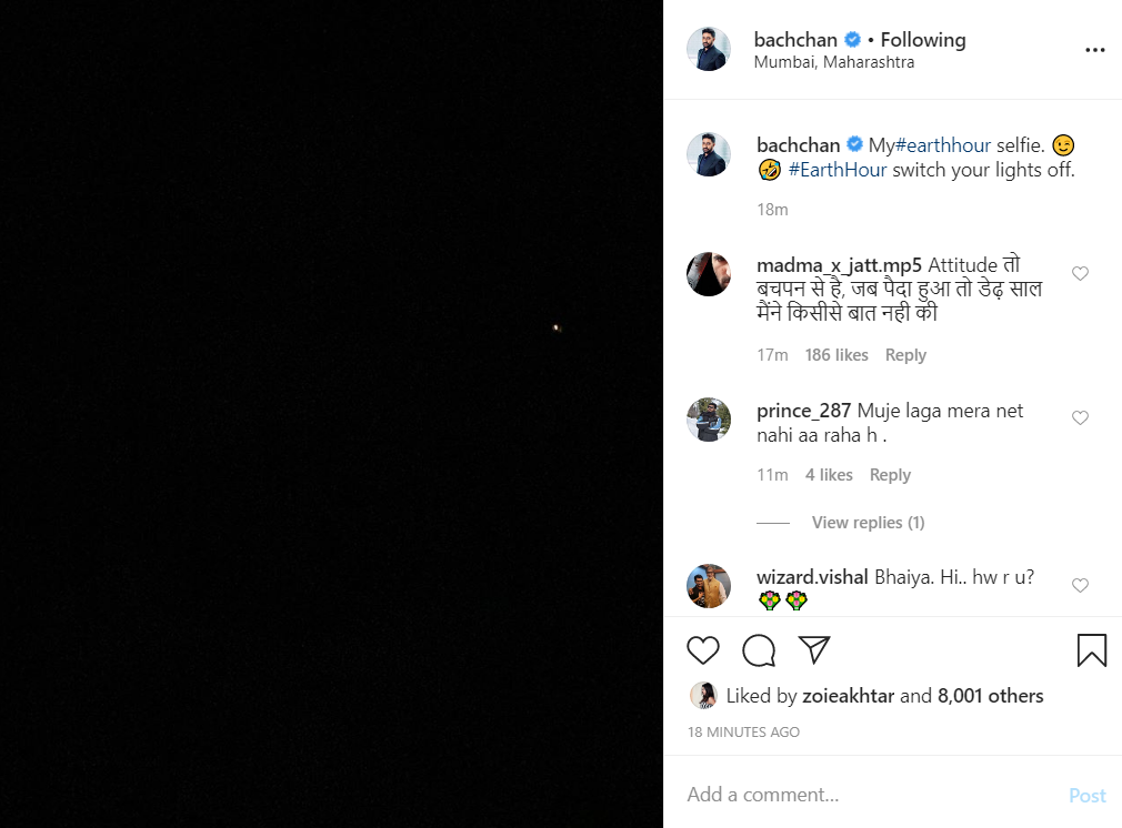 Earlier, son Abhishek Bachchan had taken to Instagram to share an 'Earth Hour' selfie, which saw a complete dark post.