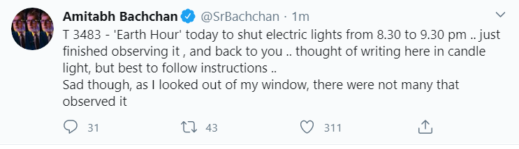 "Earth Hour' today to shut electric lights from 8.30 to 9.30 pm .. just finished observing it , and back to you .. thought of writing here in candlelight, but best to follow instructions .. Sad though, as I looked out of my window, there were not many that observed it," the tweet reads.