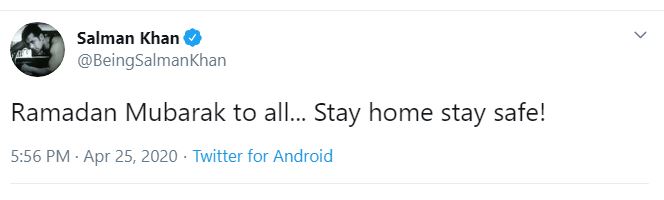 The 'Bharat' star took to Twitter and while he wished people on the auspicious occasion, he also advised them to stay at home and wrote: "Ramadan Mubarak to all... Stay home stay safe!"