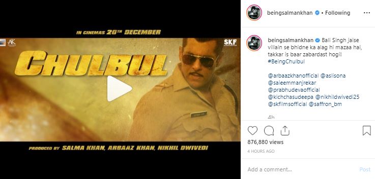 Khan captioned the post by writing, "Bali Singh jaise villain se bhidne ka alag hi mazaa hai, takkar is baar zabardast hogi! #BeingChulbul."