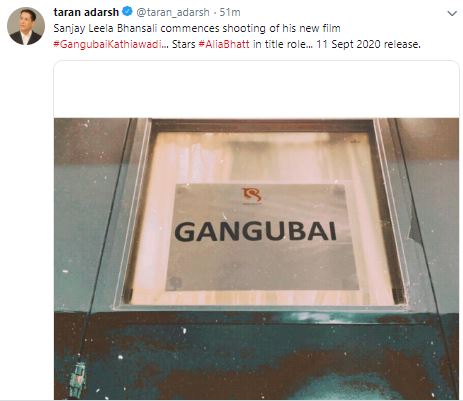 Film critic and trade analyst Taran Adarsh hopped on to Twitter to share the news, he tweeted, "Sanjay Leela Bhansali commences shooting of his new film #GangubaiKathiawadi... Stars #AliaBhatt in the title role... 11 Sept 2020 release."