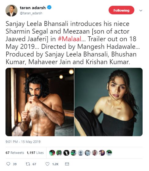 "Sanjay Leela Bhansali introduces his niece Sharmin Segal and Meezaan [son of actor Jaaved Jaaferi] in Malaal. Trailer out on 18 May 2019... Directed by Mangesh Hadawale... Produced by Sanjay Leela Bhansali, Bhushan Kumar, Mahaveer Jain and Krishan Kumar" he tweeted.