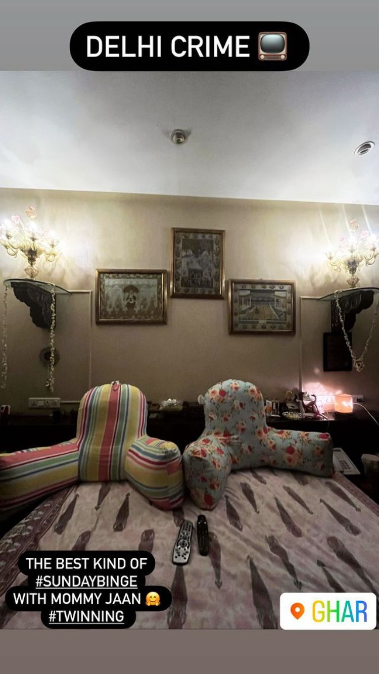 She wrote, "DELHI CRIME. The best #SUNDAYBINGE WITH MOMMY JAAN. # TWINNING." She also added the location Ghar in her post.