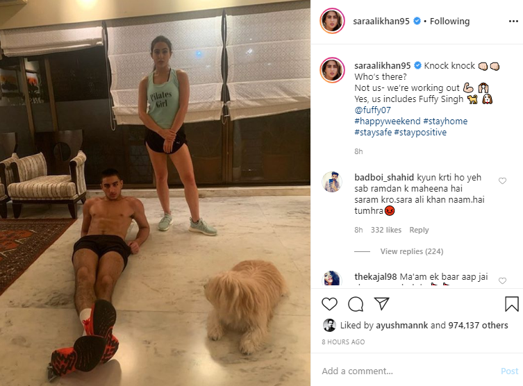 In the shared picture, the 24-year-old actor can be seen posing for the camera with her 'Pilates Girl' tee. On the other hand, Ibrahim is lying on the floor shirtless in his shorts and shoes.