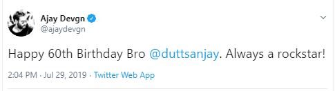 Ajay Devgn also tweeted a message for his 'rockstar' friend and wrote, "Happy 60th Birthday Bro Sanjay Dutt. Always a rockstar!"