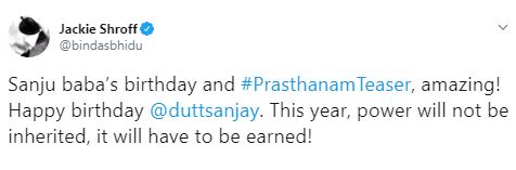 Jackie Shroff who will be seen sharing screen space with the actor in the upcoming film shared the teaser of the film on his Twitter handle and also wished the actor with luck and success on a special day. "Sanju baba's birthday and Prasthanam Teaser, amazing! Happy birthday Sanjay Dutt. This year, power will not be inherited, it will have to be earned!" he wrote.
