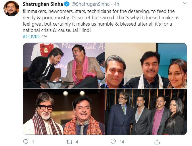 Shatrughan then appreciated the efforts by senior actors, including Amitabh Bachchan, Shah Rukh and Salman Khan and wrote, "Hats off to the great human being, famous for 'being human', a star among stars @BeingSalmanKhan most energetic, generous @iamsrk and favourite of the nation, dependable, highly responsible @SrBachchan & several others from all India film fraternity/family including South and North have contributed in their best capacity.