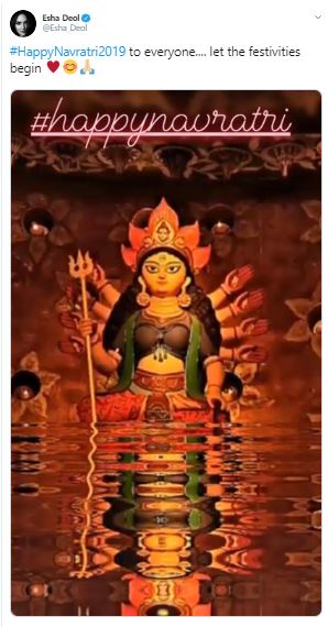 Esha Deol took to Twitter to wish her fans by posting an image of Goddess Durga and captioned the post, "HappyNavratri2019 to everyone... let the festivities begin."