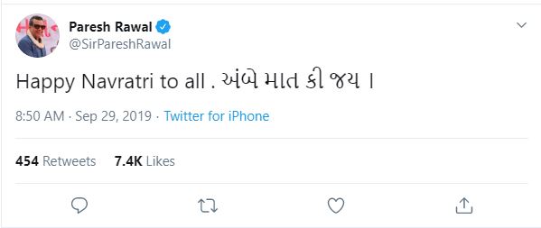 Actor-turned-politician, Paresh Rawal too extended his wishes to fans writing, "Happy Navratri to all."