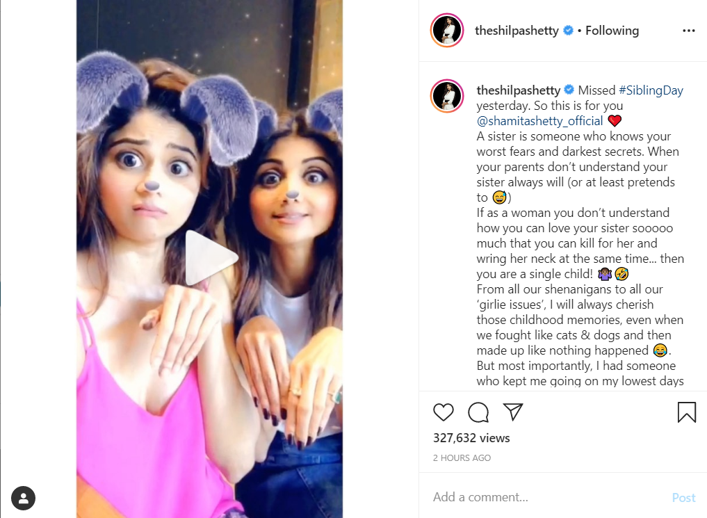 "Missed #SiblingDay yesterday. So this is for you @shamitashetty_official," the 'Dhadkan' wrote alongside the video.