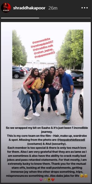 The 'Half Girlfriend' actor who will be seen performing some nail-biting stunts in the film, exuded her love and extended a word of thanks for the entire team of 'Saaho' in her Instagram story and wrote, "So we wrapped my bit on Saaho and its just been 1 incredible journey."