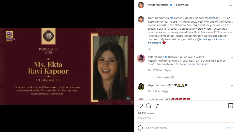 Taking to her Instagram handle, the actor-turned-union minister shared a video of Ekta being conferred the award and captioned it as, "Kumari Ekta Ravi Kapoor #padmashri... it's an absolute honour to see my friend bestowed with one of the highest civilian awards in the Nation. She has toiled for years on end to create a brand, a belief, a creative universe which transcended boundaries across many a medium."