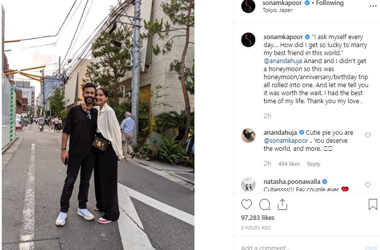 Posing with a smile on the lanes of Tokyo, Sonam wrote, "I ask myself every day... How did I get so lucky to marry my best friend in this world? Anand Ahuja and I didn't get a honeymoon so this was honeymoon/anniversary/birthday trip all rolled into one. And let me tell you it was worth the wait. I had the best time of my life. Thank you, my love."