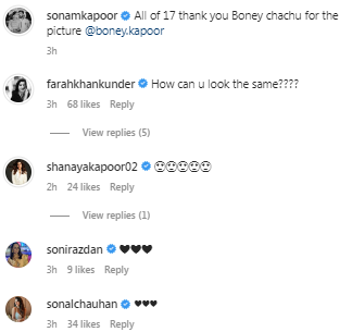 Family members Shanaya Kapoor and Sanjay Kapoor showered their love. Soni Razdan and Filmmaker Farah Khan also commented on her post.