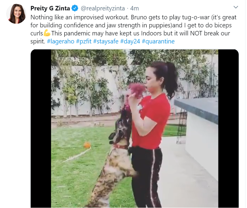 The 45-year-old actor on Saturday took to Twitter to share a video of where she, clad in a gym outfit, is seen doing her 'biceps curls' with the help of her pet, Bruno.