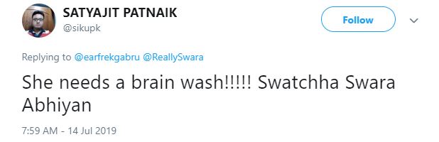Another user called the actor a 'Muslim terrorist' and wrote, "Swara is a Muslim terrorist."
