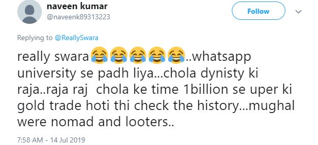 "Really swara..whatsapp university se padh liya...chola dynisty ki raja..raja raj chola ke time 1billion se uper ki gold trade hoti thi check the history...mughal were nomad and looters."