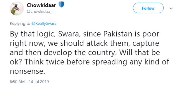 "By that logic, Swara, since Pakistan is poor right now, we should attack them, capture and then develop the country. Will that be ok? Think twice before spreading any kind of nonsense," tweeted another user.