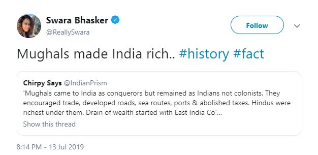 Swara's yesterday shared an article on her twitter handle titled 'Mughals' didn't loot India'. Above her tweet, expressing her thought over the said piece, the actor wrote- "Mughals made India rich.. #history #fact".
