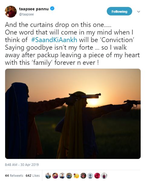 The ‘Mulk’ actor, who got emotional over the wrap-up, took to her Twitter handle and wrote, “And the curtains drop on this one..... One word that will come in my mind when I think of Saand Ki Aankh will be ‘Conviction’ Saying goodbye isn’t my forte ... so I walk away after packup leaving a piece of my heart with this ‘family’ forever n ever!.”