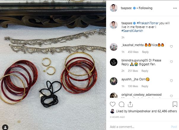 In the picture, the ‘Judwaa 2’ actor shared some accessories from the sets which include red glass bangles, earrings, silver anklets and a neckpiece, which might be linked to the character Taapsee is essaying the film.