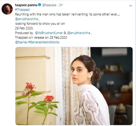 "#Thappad Reuniting with the man who has taken 'reinventing' to some other level.... @anubhavsinha , looking forward to show you all on 28 Feb 2020. Produced by @itsBhushanKumar & @anubhavsinha , Thappad will release on 28 Feb,2020 @tseries #BenarasMediaWorks", the tweet read.