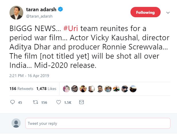 Announcing the news via his Twitter account, film critic Taran Adarsh, tweeted, “BIGGG NEWS. Uri team reunites for a period war film. Actor Vicky Kaushal, director Aditya Dhar and producer Ronnie Screwvala. The film [not titled yet] will be shot all over India. Mid-2020 release.”