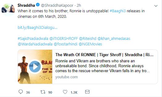 Shraddha Kapoor also shared the video on Twitter and wrote, "When it comes to his brother, Ronnie is unstoppable! #Baaghi3 releases in cinemas on 6th March 2020. "