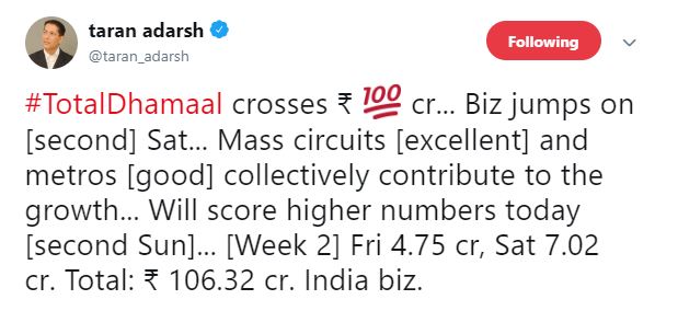 He wrote, “#TotalDhamaal crosses ₹ 100 cr... Biz jumps on [second] Sat... Mass circuits [excellent] and metros [good] collectively contribute to the growth... Will score higher numbers today [second Sun]... [Week 2] Fri 4.75 cr, Sat 7.02 cr. Total: ₹ 106.32 cr. India biz.”