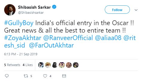 Wishing luck to the director Zoya Akhtar and the film's team, a netizen wrote, "#GullyBoy India's official entry in the Oscar !! Great news & all the best to the entire team !! #ZoyaAkhtar @RanveerOfficial @aliaa08 @ritesh_sid @FarOutAkhtar."