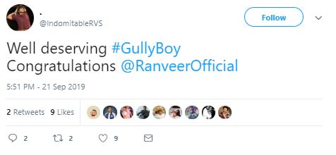 "Congratulations @RanveerOfficial #GullyBoy #GullyBoyForOscars," said another Twitter user, praising while praising the blockbuster.