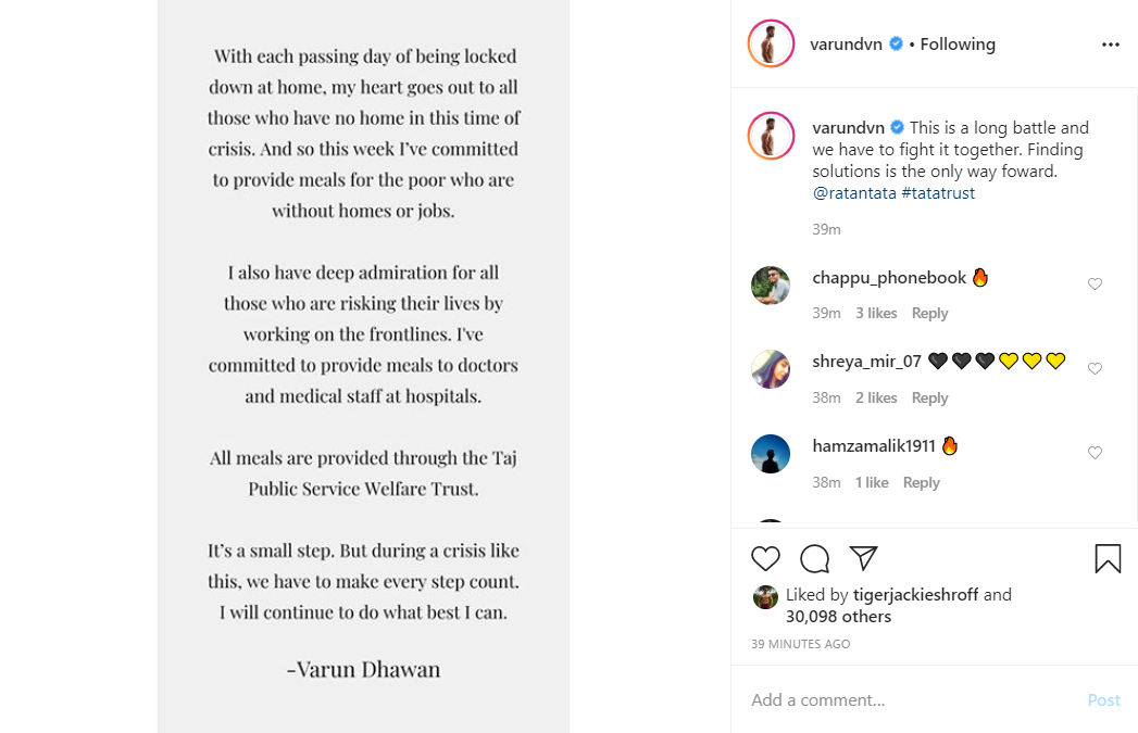 Acknowledging his admiration for all the people working on the frontlines, risking their lives, the 'Kalank' actor further wrote that: "I have committed to provide meals to doctors and medical staff at hospitals."