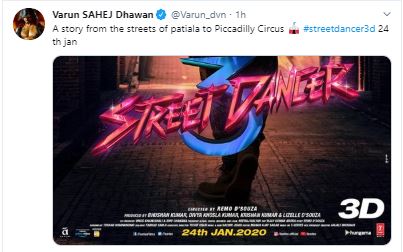 The 32-year-old actor shared the poster featuring himself making a dance move on Twitter and wrote: "A story from the streets of Patiala to Piccadilly Circus #streetdancer3d 24th Jan."