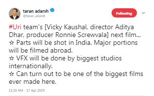 “BIGGG NEWS. Uri team reunites for a period war film. Actor Vicky Kaushal, director Aditya Dhar and producer Ronnie Screwvala. The film [not titled yet] will be shot all over India. Mid-2020 release,” he had said.