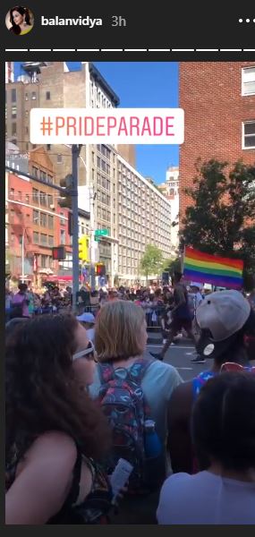 The 'Tumhari Sulu' actor shared pictures and videos on Instagram stories where she can be seen waving the LGBTQ rainbow flag along with a video of the Pride Parade where several people thronged the streets of New York to celebrate the occasion with great joy.