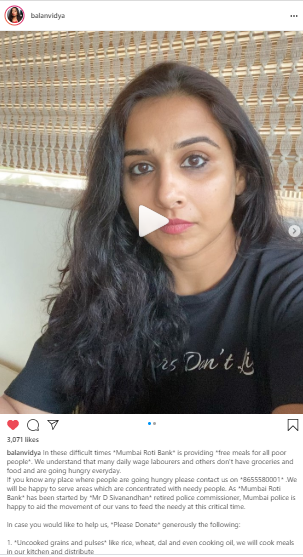 Balan shared the contact details of the Mumbai Roti Bank volunteers and urged her Instafam to contact the volunteers in case they find someone in need of food.