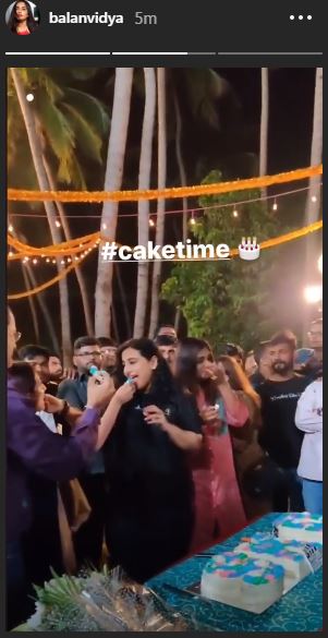 In the snaps, Vidya is seen posing with director Anu Menon and producer Vikram Malhotra while cutting the cake.