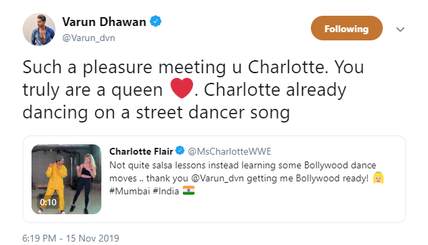 While retweeting the same, the 'Judwa 2' actor wrote, "Such a pleasure meeting u Charlotte. You truly are a queen. Charlotte already dancing on a street dancer song."