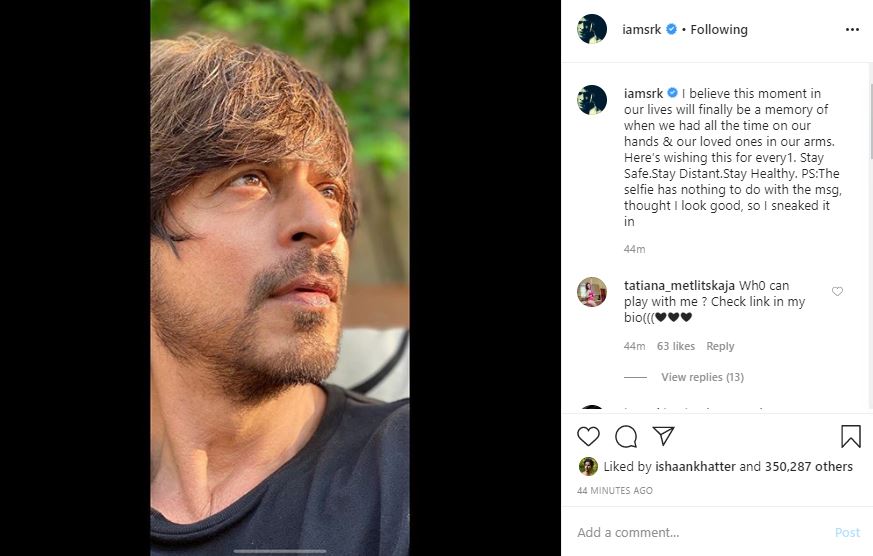 Shah Rukh captioned the post as,"I believe this moment in our lives will finally be a memory of when we had all the time on our hands & our loved ones in our arms. Here's wishing this for every1. Stay Safe. Stay Distant. Stay Healthy. PS: The selfie has nothing to do with the msg, thought I look good, so I sneaked it in."