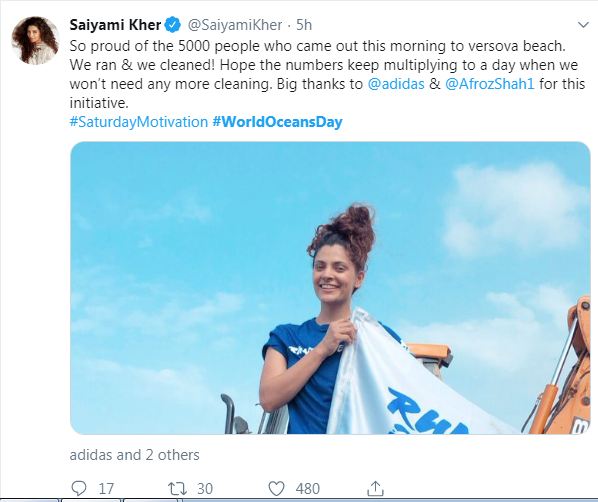 Saiyami Kher who made her Bollywood debut with the film 'Mirzya' opposite Harshvaardhan Kapoor posted a picture on Twitter with a banner which read "Run for Oceans". "So proud of the 5000 people who came out this morning to Versova beach. We ran & we cleaned! Hope the numbers keep multiplying to a day when we won't need any more cleaning. Big thanks to Adidas & Afroz Shah for this initiative," she wrote.