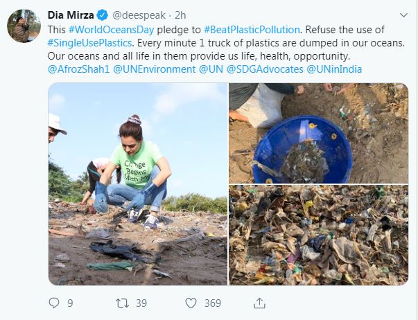 Dia Mirza, who is United Nations Environment Goodwill Ambassador for India, posted pictures on her Twitter handle where she can be seen clearing waste from a sea shore. "This World Oceans Day pledge to Beat Plastic Pollution. Refuse the use of Single Use Plastics. Every minute 1 truck of plastics are dumped in our oceans. Our oceans and all life in them provide us life, health, opportunity," she wrote.