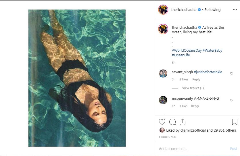 "As free as the ocean, living my best life," wrote Richa Chadha who posted a picture on Instagram where she can be seen soaking the sun and swimming in the ocean.