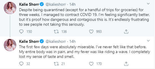 "Despite being quarantined (except for a handful of trips for groceries) for three weeks, I managed to contract COVID 19. I'm feeling significantly better, but it's proof how dangerous and contagious this is. It's endlessly frustrating to see people not taking this seriously," she tweeted.