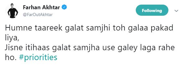 "Humne taareek galat samjhi toh galaa pakad liya, Jisne itihaas galat samjha use galey laga rahe ho" (I got the date wrong and was held by the neck, but those who got history wrong are being embraced by all of you)," Farhan tweeted in an apparent reference to multiple BJP leaders who were seen misquoting historical facts during their rallies.