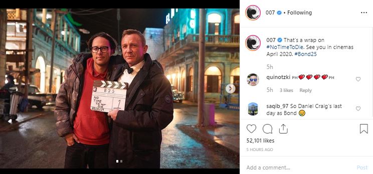 The news was shared by 007's official Instagram account with a snap of Daniel Craig posing in his iconic Bond suit and a clapperboard with director Cary Fukunaga, along with the caption, "That's a wrap on #NoTimeToDie. See you in cinemas April 2020. #Bond25"Earlier this month, the first poster of the film was unveiled. The movie will hit the screens on April 3, next year in India.