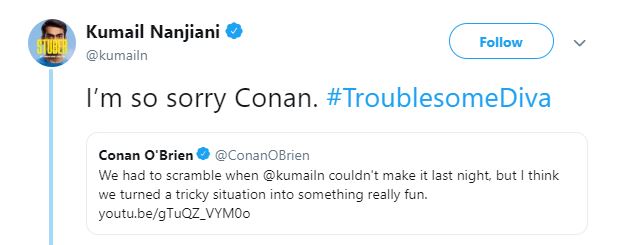 Taking to Twitter, the 41-year-old actor wrote, "I'm so sorry Conan," in response to O'Brien, who wrote, "We had to scramble when @Kumalin couldn't make it last night, but I think we turned a tricky situation into something really fun."