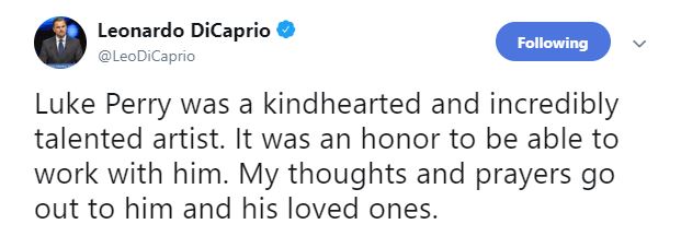 After Perry’s death, DiCaprio paid tribute to his co-star in the film. He took to his Twitter and wrote, “Luke Perry was a kindhearted and incredibly talented artist. It was an honor to be able to work with him. My thoughts and prayers go out to him and his loved ones.”