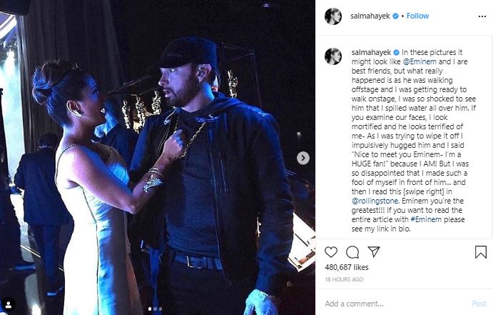 The post included three pictures, the first two frames featured the 53-year-old actor and Eminem, talking and hugging backstage at the ceremony. The third picture shows a quote that Eminem gave to Rolling Stone which noted if the 'Love the Way You Lie' rapper enjoyed the Oscars, and he said, "' Absolutely,' he said.' I got to hug Salma Hayek!'"