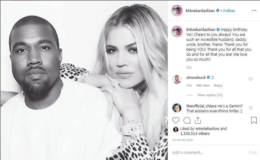 Sharing a monochrome picture with the birthday boy on Instagram, Khloe Kardashian wrote, "Happy birthday Ye!! Cheers to you always! You are such an incredible husband, daddy, uncle, brother, friend to us all. Thank you for being YOU! Thank you for all that you do and for all that you are! We love you so much!!"
